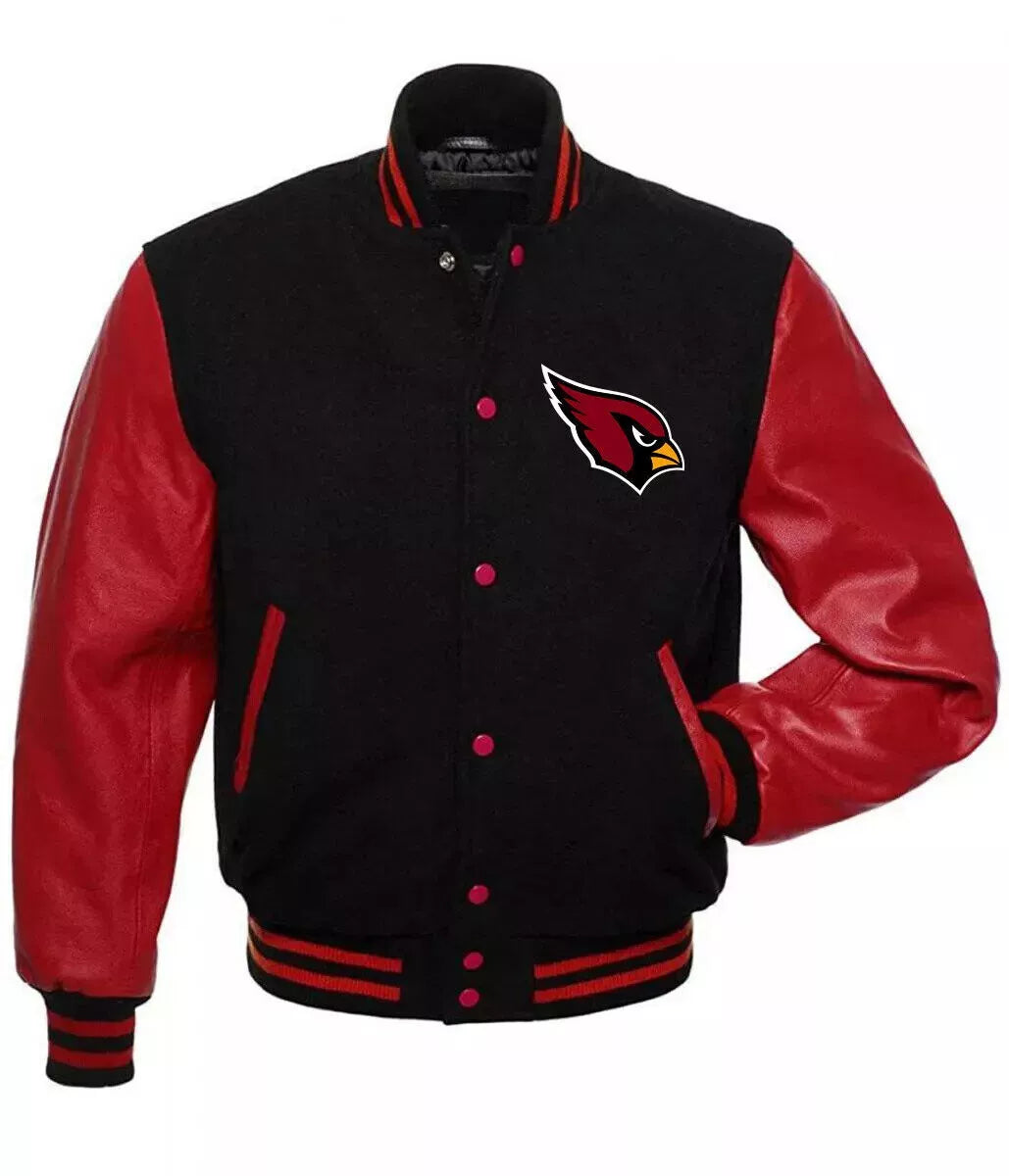 Show your team spirit in style with the Men’s Arizona Cardinals Varsity Jacket. Featuring a combination of high-quality wool and genuine leather sleeves, this jacket offers a sleek, durable design that’s perfect for any NFL fan. The bold black and red color scheme showcases the Arizona Cardinals’ iconic team colors, making it a standout piece for both game days and casual wear. Whether you're at the stadium or out on the town, this jacket ensures comfort and style all season long.