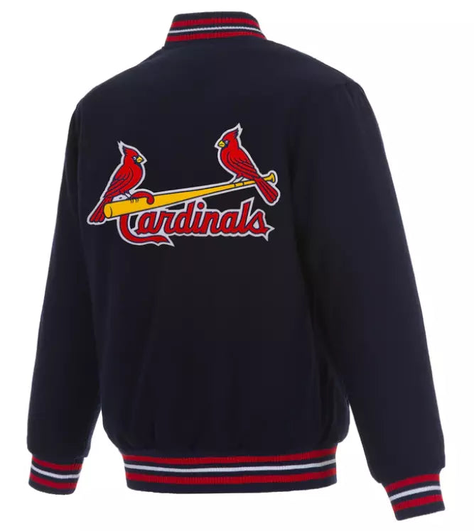 Show your St. Louis Cardinals pride with this Men’s Black Wool Letterman Varsity Jacket, featuring embroidered logos. The classic black wool body combined with high-quality embroidered team logos on the chest ensures your fan spirit is front and center. The iconic Cardinals logo adds authenticity, making it the perfect way to showcase your team pride in style.